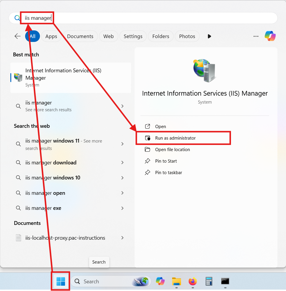 Open IIS Manager as Administrator. You can search for IIS Manager in the Start menu or find it under Control Panel > System and Security > Windows Tools: