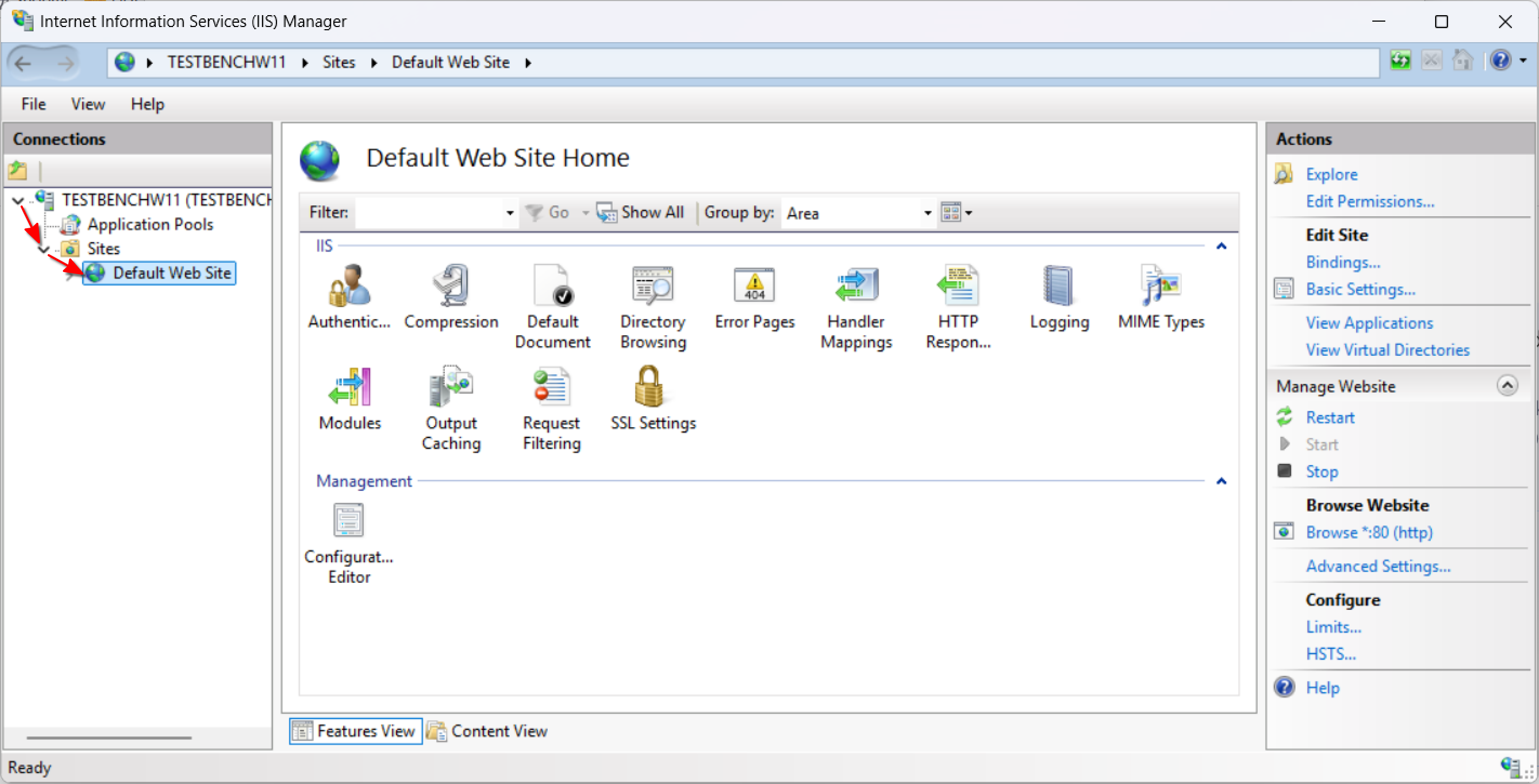 In the Connections pane on the left, expand your server name, then expand the Sites node, and select Default Web Site