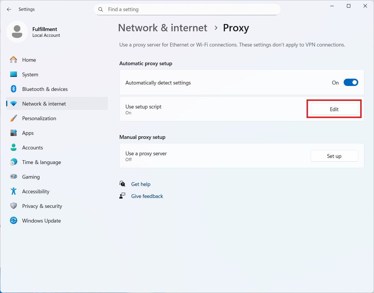 Under Proxy, select Use Setup Script -> Edit